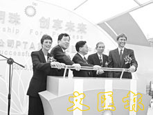 BP高層和北京、廣東省、珠海市領導共同指令珠海BP一期生產線啟動。左起:BP集團亞洲事業部總裁蘇芮婷、珠海市市長王順生、廣東省人民政府副秘書長李春洪、中國紡織工業協會副會長許坤元、BP集團執行副總裁高拜倫博士。 (劉士昕 攝)