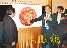 周伯展(右二)解釋黃斑退化患者的眼前影像的扭曲情況就猶如「月餅」上的文字。其兩側分別是民政事務局局長何志平及眼科學會會長高德全。 (羅瑩芝攝)