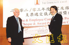 匯豐銀行再次獲得「超卓貢獻大獎」,匯豐負責人雷德明將支票交予曾俊華局長。