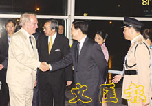 政制事務局局長林瑞麟和行政長官榮譽副官戴應剛在機場迎接德國總統約翰內斯.勞。