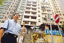 黃哲民指著飼養流浪狗的空置唐樓。 (劉國權 攝)