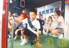 「九二一大地震四週年——消防競技搜救演練」21日在「國父紀念館」北側廣場舉行,大人小孩一起坐上地震體驗車,親身體驗震撼。 (中央社)