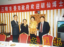 胡仙博士(右三)和福建省副省長王美香在歡迎酒會上。右一為福建省人大僑委主任、原新華社香港分社研究部部長楊華基。