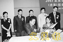 2003武漢市東西湖區(香港)招商推介會在港舉行,區長彭麗敏(後排右二)一眾領導觀看簽約情況。 (張偉民 攝)