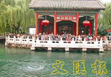 趵突泉自9月6日恢復噴湧以來,每日前來觀泉的遊客過萬人。圖為國慶日觀泉者人海如潮。 (王斌 攝)