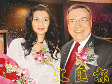 美國詩思公司總裁、主席兼行政總裁郭偉思(右),與中國首席名模、「美神萊」國際代言人姜培琳(左)出席穗專賣店開張儀式。