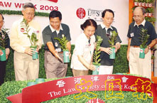 【本報訊】(記者 邱萍菲)「法律週2003」昨日在香港公園一片青b中揭開序幕,多名本港知名法律界人士,包括律政司司長梁愛詩、終審法院首席法官李國能、大律師公會主席陳景生、「綠的歡欣」主席譚惠珠及律師會會長葉成慶等人,皆以一身輕便而充滿「綠色」氣息的打扮出席開幕禮,配合法律週今年「環境保護與法例」的主題。