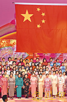 今年的婦女合唱團秉承以往特色,再次由150位身穿五彩繽紛旗袍的各界婦女組成,合唱《歌唱祖國》及《一點燭光》,表達她們對祖國的敬意。而財政司司長唐英年及其母親唐尤淑圻則以寫書法,祝賀祖國華誕。
