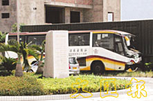 肇事旅遊巴車頭嚴重損毀,被交警大隊扣查。