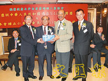 劉志明(右一)陪同葉萬權、黃熾雄致送紀念品予譚立仁名譽會長。 (鄭群 攝)