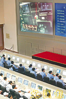 這是北京航天指揮控制中心現場的屏幕上方顯示的神舟四號飛船艙內的實況。(新華社)