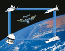 美國正謀劃用穿梭機參戰。圖為美國太空總署四款新一代穿梭機設計圖,包括有翼的飛機型設計和「阿波羅」號現代版(左下)。 (法新社)