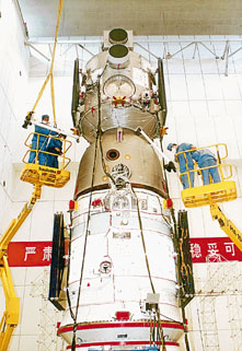 03年,中國第一艘載人飛船--「神舟五號」準備升空。