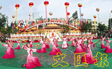 第6屆北京國際旅遊文化節舉行盛大婚慶盛裝行進表演,來自國內外的50多個表演團隊、近3,000名民間藝術家及出席第15屆世界旅遊組織大會的各國官員與20萬首都群眾歡聚北京平安大街。 (新華社)