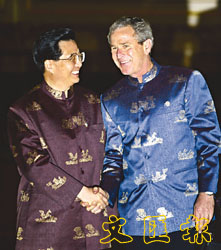 中國國家主席胡錦濤與美國總統布什握手。(路透社)