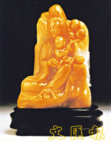 觀音像,王祖光作品。此雕刻所用石種曰黃荔枝凍,是壽山石的一種。