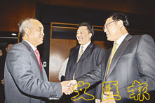 新基建主席鄭家純(左)及航天科技國際主席芮曉武(中)出席簽字儀式。 (張偉民 攝)