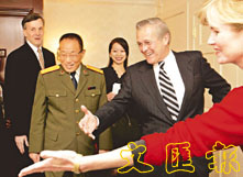 【據中新社華盛頓28日電】美國國防部長拉姆斯菲爾德28日中午在五角大樓與來訪的中國中央軍委副主席、國務委員兼國防部長曹剛川上將舉行了會談,雙方著重談到了兩軍關係和台灣問題。