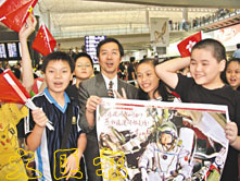 近500名黃楚標學校師生及家長組成歡迎隊伍,並製作逾百幅歡迎楊利偉的紙板、填寫心意卡等,以歡迎楊利偉的蒞臨。校長梁兆棠表示,希望藉著今次歡迎楊利偉的活動,可加深學生的愛國情懷。 (羅敬文 攝)