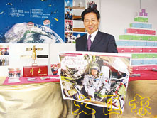李華佐讚揚這張楊利偉海報十分漂亮,更向記者多索一張以作珍藏。 (梁祖蓮 攝)