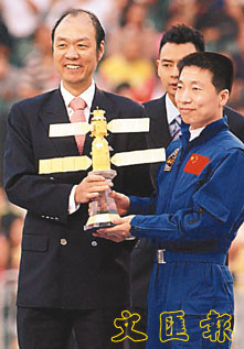 恆豐金業集團主席林世榮向楊利偉贈送「黃金美鑽神舟五號飛船」紀念品。
