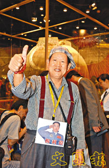 中國人可真正揚眉吐氣了!黃伯滿懷豪情豎起大拇指,更將本報楊利偉的照片剪下過膠掛在胸前。 (趙焜崗 攝)