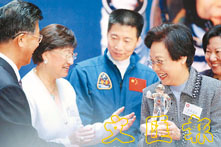 香港各界婦女聯合會代表與訪港的航天飛行代表團相互贈送紀念品。(中新社)