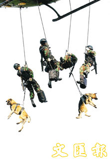 雅加達武裝特種部隊的士兵和警犬從直升機上吊下,進行反恐襲擊演習。自從峇厘發生大爆炸,印尼政府積極反恐。