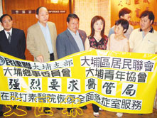 黃容根(左三)連任四屆區議員,服務社區被居民讚盡心盡力。圖為早前他與其他團體要求醫管局在那打素醫院恢復全面急症室服務。 (資料圖片)