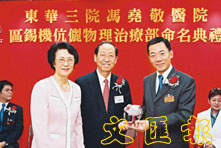 【本報訊】東華三院馮堯敬醫院日前舉行區錫機伉儷物理治療部命名典禮,東華三院主席暨東華三院馮堯敬醫院醫院管治委員會主席楊超成於典禮上致詞時謂,在東華三院及醫院管理局緊密合作下,東華三院馮堯敬醫院近年積極發展院務,董事局本年度更撥款一百二十多萬元予該院添置多部醫療儀器,以便幫助醫護人員進行更詳細及準確的檢查和診斷,提供更完善的服務。