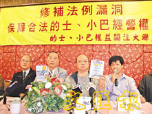 「大聯盟」黎銘洪(左二)及郭志標(右二)展示有非專營巴士以會員制提供非法服務。(甄健輝 攝)