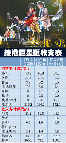 雖然「維港巨星匯」的收入近5,300萬,較7月份的預期大增近3,700萬。但總支出卻接近1億5,300萬元,較7月份的預算亦增加3,600多萬,總虧損正好是當局的包底承諾數目,不多一元,也不少一角。報告指出,收入大增主要與籌辦單位增加門票收費有關;支出增加除因藝人歌酬、宣傳費用大增外,亦因7月份預算未有包括表演者機票、酒店住宿費、保險費和租場費用等。