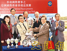 曾蔭權昨日在沙田馬場主持亞洲國際都會香港盃預賽頒獎典禮。圖為曾蔭權頒發獎盃予得獎馬匹威勝旺的馬主。