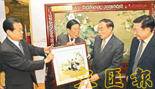 圖為張學忠(左二)和張中偉(左一)向王鳳超贈送著名的川繡。右一為全國人大華僑委員會委員、中聯辦原副主任劉山在。