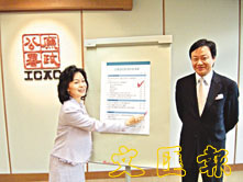李程寶嫻和香港董事學會主席許浩明,向記者介紹《商界誠信管理資料冊》內容。(冼文達攝)