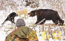 這隻頸上戴了鐵鍊的大熊,是白俄羅斯一個獵人訓練獵犬的教練。(法新社)