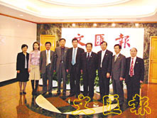 【本報訊】17日,攀枝花市委書記張成明(右四)一行到本報訪問,受到張國良社長、仇學忠常務副總經理(右五)的熱情接待。雙方就如何進一步加強合作交換了意見。隨同訪問的還有市政府副秘書長鄧思強(右三)、副秘書長李軍(左四)、市發展計劃委員會主任李章杰(右二)、市旅遊局長盧宗祥(右一)。參加會見的還有香港文匯龍國際投資有限公司總經理楊天龍(左三)、副總經理楊瑛黎(左二),本報總經理室副總經理馮雲(左一)等。
