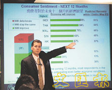 AC尼爾森亞太區及新興市場總裁馬伏麟昨日表示,「沙士」過後,在旅遊業復甦、失業率下降、CEPA簽訂、美國經濟好轉等利好因素下,港人增加了對前景的信心,同時亦增加了消費,兩者相輔相成。但本港經濟是否持續改善,還要看外圍因素,例如美國經濟。他又說,港人對就業的關注是可以理解的,經過過去多年的經濟低潮,距離完全樂觀仍需一段時間。