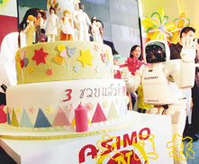 本田Asimo機械人3歲啦!可以在曼谷的生日會上切生日蛋糕,「他」開心得手舞足蹈。 (美聯社)