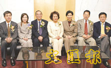 左起:蕭耿、李紀珠、厲以寧、江素惠、鍾琴、石齊平及樊綱參加香江經貿論壇。 (張偉民 攝)