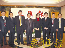 來港參加「CEPA中小企商機博覽」活動的海南省參訪團昨到本報訪問,就海南明年赴港招商的有關事宜與本報領導交換意見。左起:海南省商務廳助理巡視員姚繁、海南省貿易促進會會長陳泰生、本報副總經理仇學忠、海南省商務廳廳長彭瑞林、本報副社長劉永碧、海南省藥品監督管理局局長曾渝、海南省商務廳巡視員劉憲章、本報副總編輯劉曼軍。(熊君慧 攝)