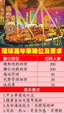 該公司將於今、明兩日在逸東酒店舉行招聘會,聘請500個臨時員工,主要為機構及攤位遊戲助理,要求中學畢業(詳情見表),日薪約為300至400元。有意者可查詢www.world-carnival.com。