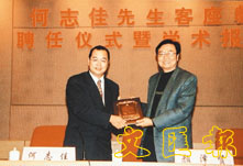 【本報訊】香港立藝珠寶手藝有限公司董事長、廣西壯族自治區政協委員、香港青年工業家、香港十大創業先鋒何志佳先生日前受聘為華南師範大學客座教授。華南師範大學校長顏澤賢教授在會上為何志佳先生頒發聘書並致辭。