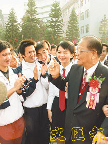 曾憲梓出席梅州曾憲梓中學十周年慶典時與學生交談。
