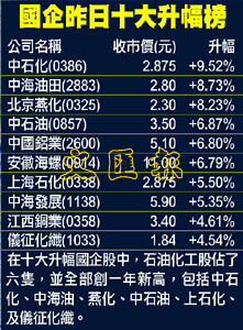32隻國企指數成分股中,31隻報升,其中有11隻創一年新高,6隻為石油化工股(見表)。