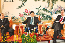 兩岸航空業界10日就春節台商包機進行初步溝通。圖為長榮航空駐北京首席代表周寶裕(左一)、「華航」駐北京首席代表王華宇(右一)與浦照洲(中)商討相關事宜。 (中新社)