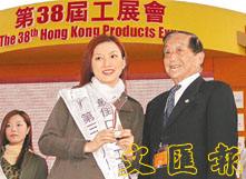 楓葉園食品公司李依文獲得本屆工展「最佳口才工展小姐獎」,廠商會副會長陸增鏞為其頒獎。 (張萍 攝)