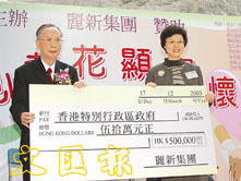 陳甘美華署長接受麗新集團主席林百欣50萬元善款支票。 (鄭群 攝)