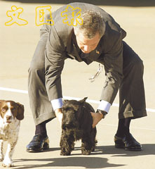 布什抱起巴尼時意外跌下眼鏡,究竟「第一小狗」重要,還是「第一眼鏡」要緊?(美聯社)