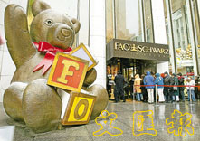 FAO Schwarz玩具公司在紐約的店外,排著長長的人龍。為了與折扣店競爭,玩具公司去年中已第二次提出了破產申請。 (法新社)